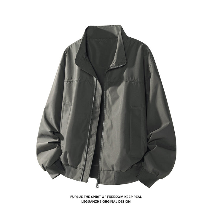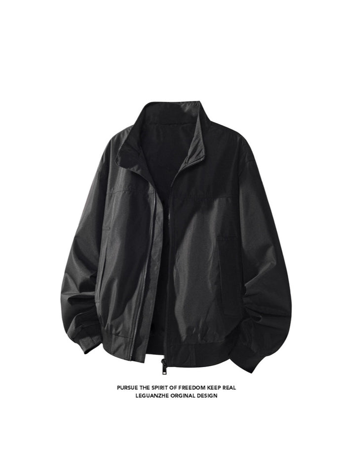Answer 1: This jacket features a three-proof design providing resistance to wind, water, and minor stains, a stylish stand collar for a structured look, and a loose fit that accommodates various body types. It is made from durable 100% polyester material.